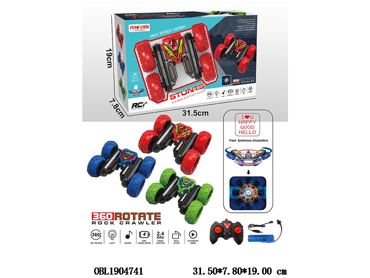 Remote control stunt car with lighting, music subtitles, and USB cable. Body 3.7V lithium battery with built-in remote control 2 * AA without built-in power, 2.4G frequency, 3-color mixed design
