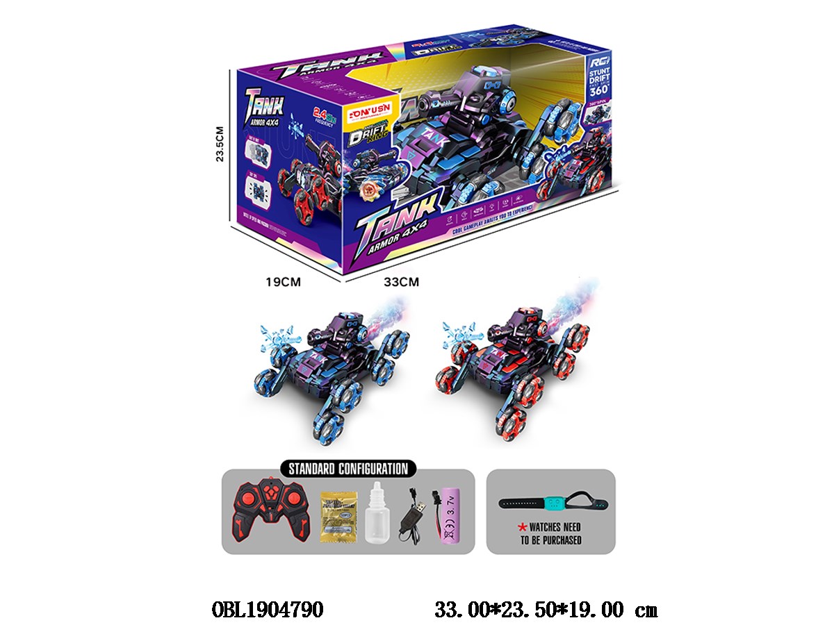 Eight wheel remote control stunt side walking tank with water bomb light spray with USB cable body 3.7v lithium battery pack electric remote control 2 * AA without power pack 2.4G frequency 2-color mixed