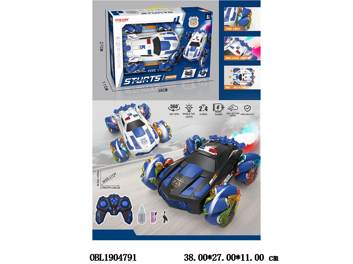 Four wheel remote control stunt side driving with light, music, spray, USB cable, body 3.7v, lithium battery pack, electric remote control, 2 * AA, no power pack, 2.4G frequency, 2-color mixed single remote control