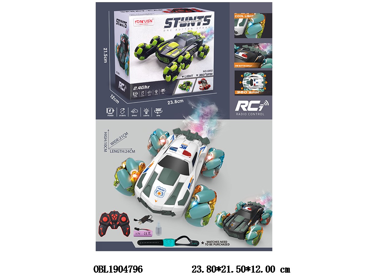 Four wheel remote control stunt side driving with light, music, spray, USB cable, body 3.7v, lithium battery pack, electric remote control, 2 * AA, no power pack, 2.4G frequency, 2-color mixed single remote control