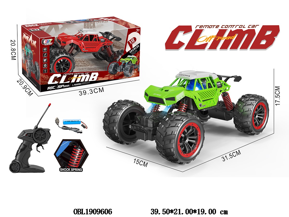 1: 12 Four way remote control climbing car with lights and USB cable. Body 3.7V lithium battery with power included remote control 2 * AA without power included. 27 frequency, 2 color mixed